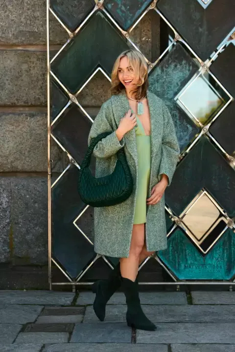 Spojte mužské a ženské prvky do jednoho outfitu. Zelená v těchto kombinacích obzvlášť vynikne – zkuste ji s oversized kabátem a jemnými šaty, jak je teď často vidět třeba v pražském centru.
