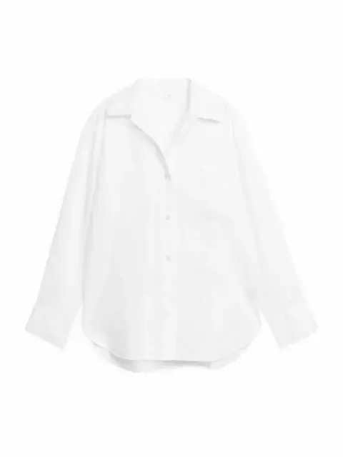 Klasická bílá lněná košile s uvolněným střihem a resort límečkem. Ideál na letní vrstvení – zaměstnané ženy určitě ocení.