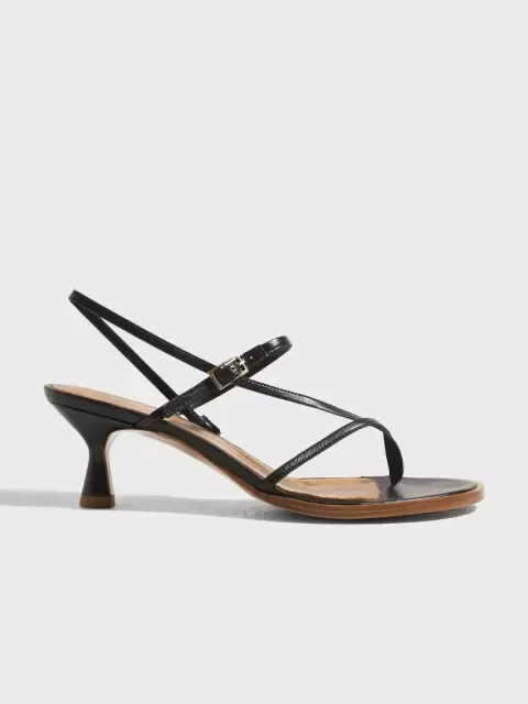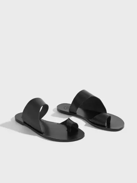Klasické černé kožené sandálky s překříženými pásky a kulatou špičkou – pohodlné, ale zároveň sofistikované.