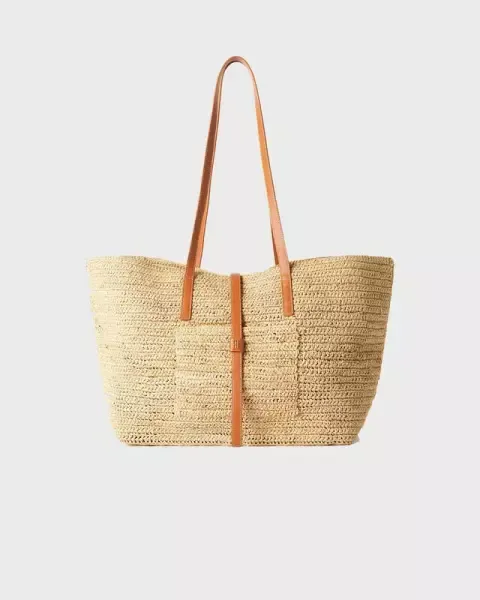 Větší taška z přírodní slámy se štíhlými koženými popruhy. Nosit můžete nejen k vodě, ale i jako každodenní letní kabelku do města.
