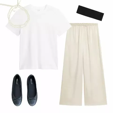 Jednoduché, ale velmi efektivní! Hedvábné kalhoty udrží komfort v horkém dni a zároveň nabídnou casual eleganci. Navíc můžete celý outfit sehnat za rozumné peníze.
