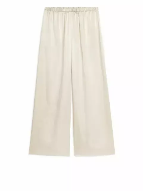 Lehoučké kalhoty v barvě slonové kosti z morušového hedvábí. Elastický pas a široké nohavice zajistí pohodlí celý den.