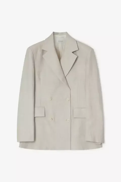 Nadčasové sako z lnu a s decentní strukturou můžete nosit i několik let. Slaďte s šortkami nebo kalhotami ze stejného materiálu.