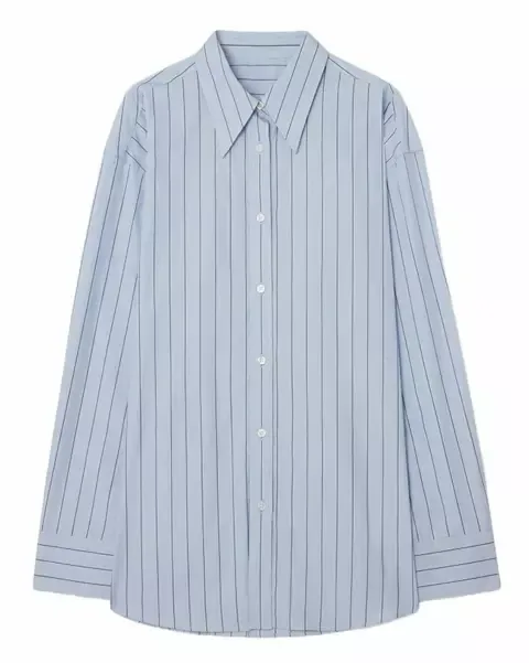 Košile z bavlněného popelínu s jemným proužkem, delším zadním dílem a decentní výšivkou. Působí neformálně a zároveň stylově.