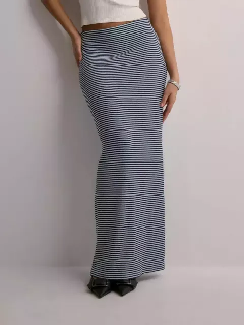 Dlouhá sukně z pruhovaného úpletu v námořní modři a bílé. Můžete ji zkombinovat s odpovídajícím svetrem do setu nebo nosit zvlášť třeba s bílým tílkem.