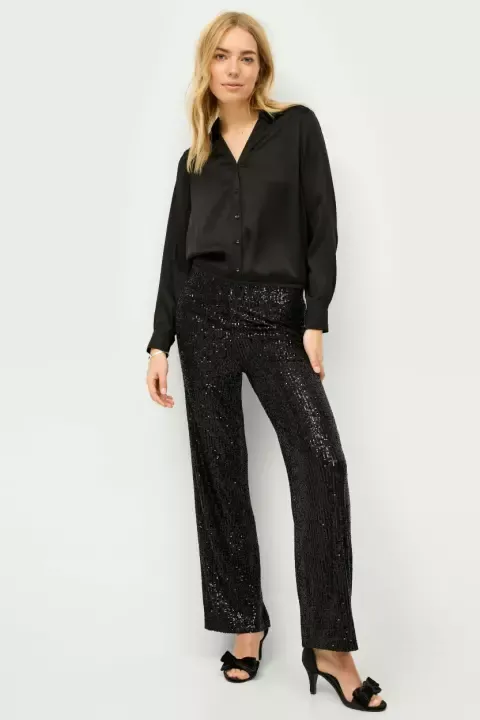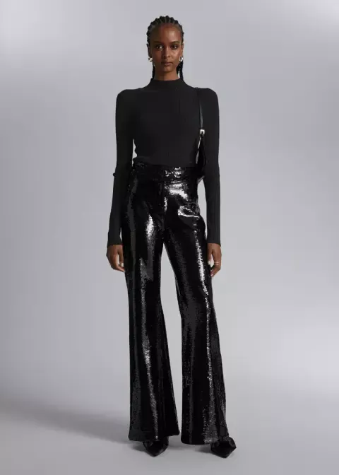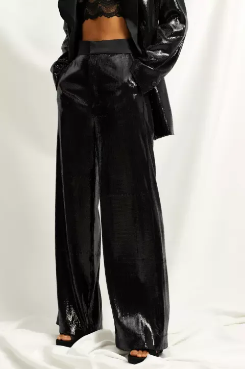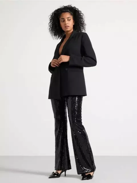 Elegantní kalhoty s rozšířenou nohavicí, k mání v černé či stříbrné. Ideální pro výraznější party look. Více na oficiálním e-shopu Lindex.