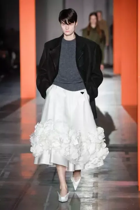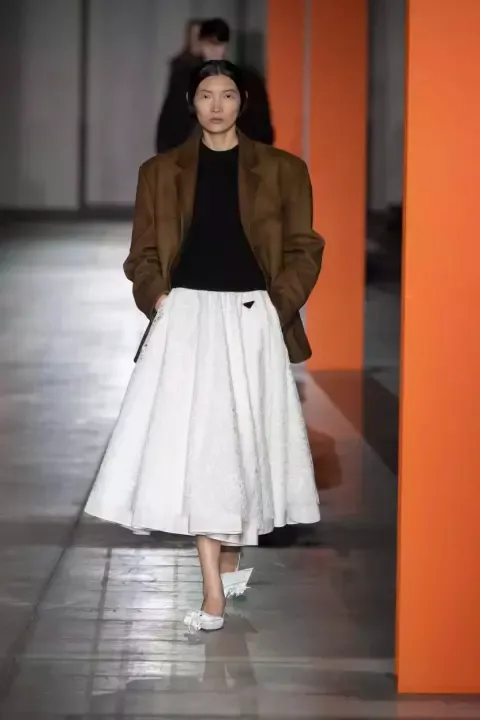 Dlouhé volné sukně dominovaly také samotné přehlídce Prada, kde je značka ukazovala v řadě variant.