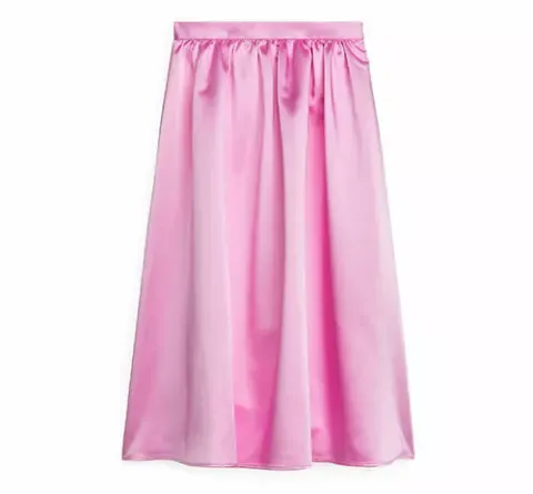 Růžové saténové sukně od Arketa jsou letos žádané, a tato volná varianta podtrhuje ikonický trend Barbiecore. Svěží růžová pozvedne váš styl do práce i na večírek! REKLAMA Koupit můžete zde.