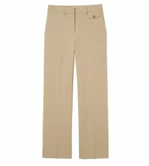 Kostýmové kalhoty se zvýšeným pasem a puky krásně prodlouží siluetu a padnou téměř každému typu postavy. Mají příjemný rovný střih, díky kterému vypadají velmi elegantně i s teniskami.