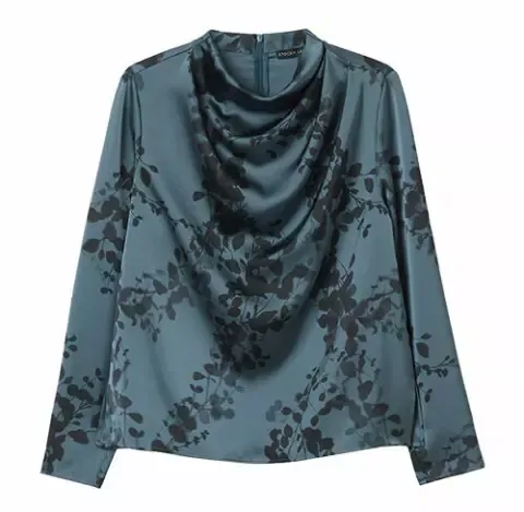 Celý vzhled dotváří dlouhý saténový top s dekorativním řasením kolem výstřihu. Zdůrazněné manžety s potaženými knoflíky působí velmi luxusně a detailně – stačí přidat náušnice a můžete vyrazit i na večerní akci v centru Prahy.