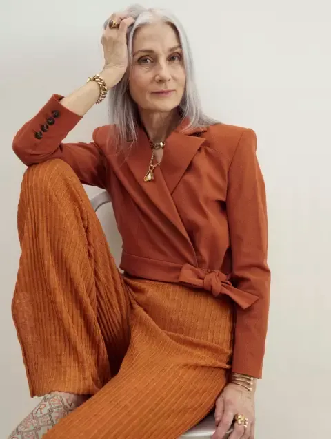 • Oranžové sako i kalhoty a výrazné šperky doporučuji kombinovat s neutrální botou.