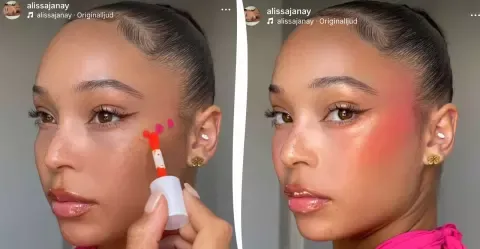 - Začněte růžovou tvářenkou na vrcholcích lícních kostí.