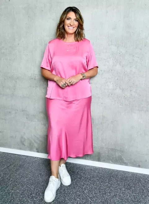 - Kombinujte monochromaticky – tričko a sukně stejných tónů vytvoří efekt luxusu.