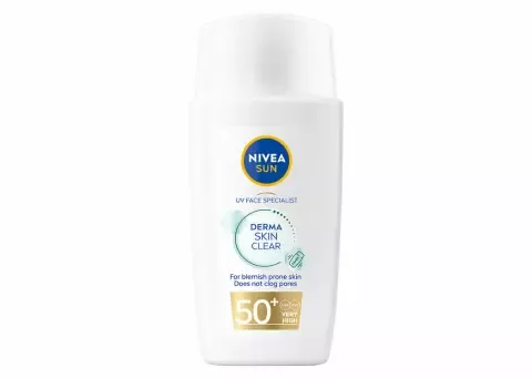 Derma Skin Clear SPF50+ od Nivea Sun oceníte, když máte sklony k akné. Obsahuje niacinamid a komplex proti pupínkům, minimalizuje ucpávání pórů a mastnou T-zónu. Dostupné běžně v DM nebo Rossmann.